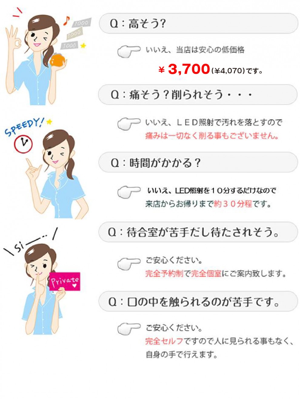 「高そう」「痛そう」「時間が無い」「待合室が苦手」